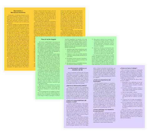 Escrita por miembros, nuestra literatura ofrece identificación y un mensaje de esperanza para el adicto que todavía sufre. La literatura de recuperación es una fuente de ayuda muy grande para miembros, futuros miembros y todo aquel que quiera ayudar a otro adicto.